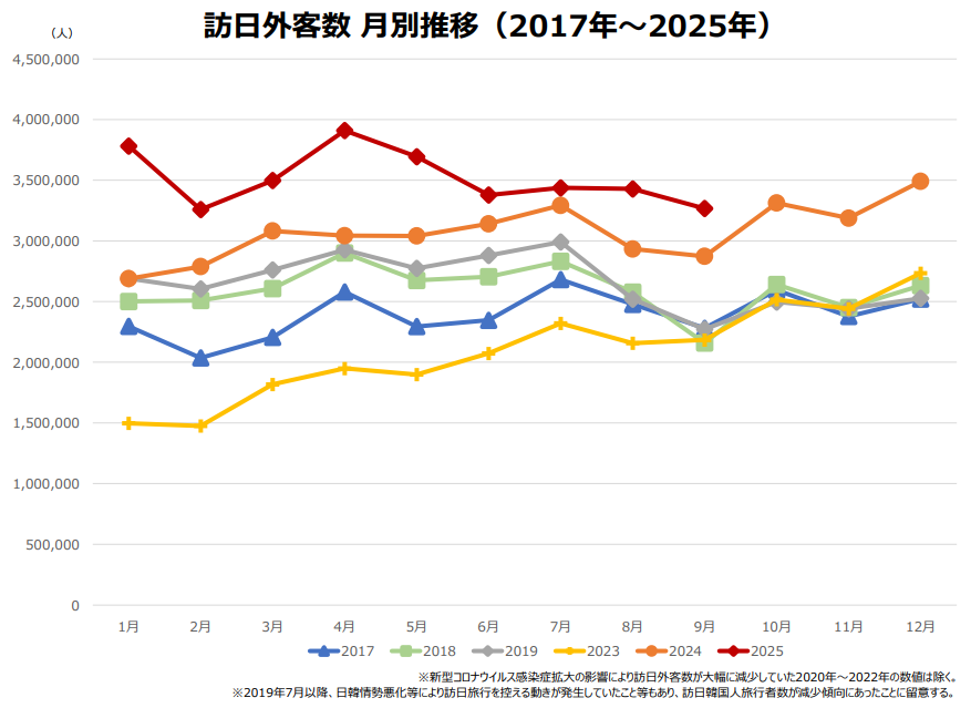 2025年9月の訪日外客数が発表されました。9月は3,266,800人となり、前年同月比では+13.7%増でした。